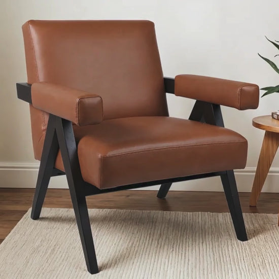 A sleek mid-century modern chair with plush leather upholstery and a bold angular wooden frame.